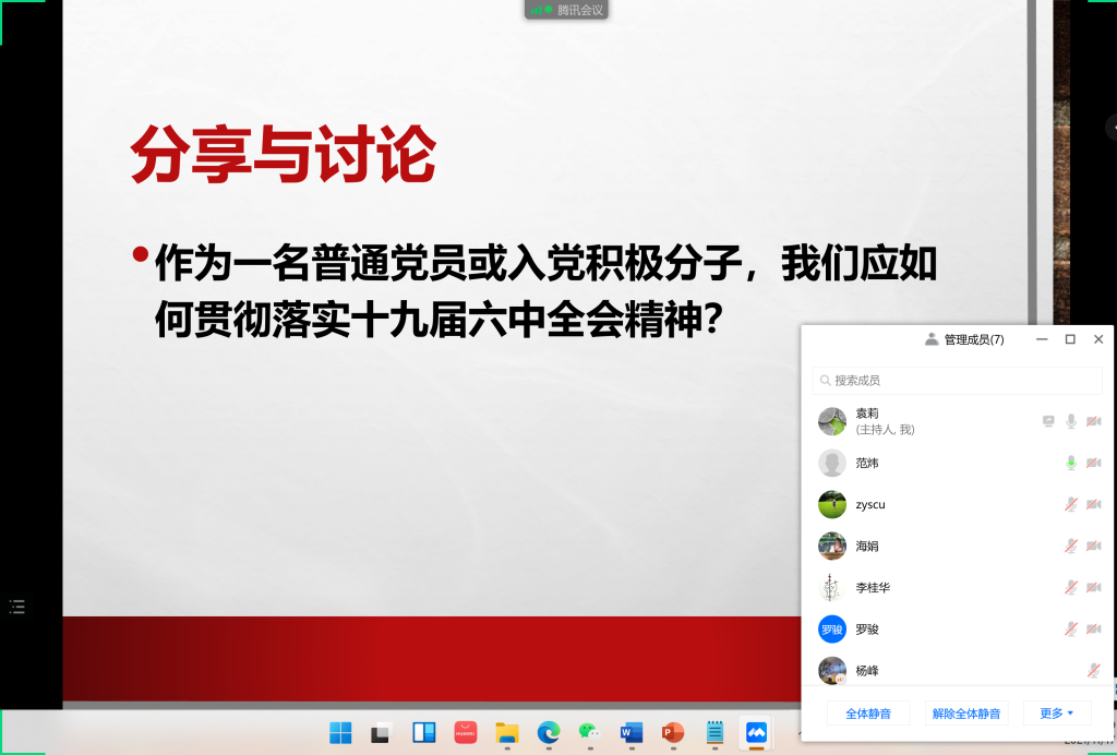 最后,教工六支部的全体党员和入党积极分子结合自身体会,对如何贯彻落实十九届六中全会精神展开了热烈讨论。