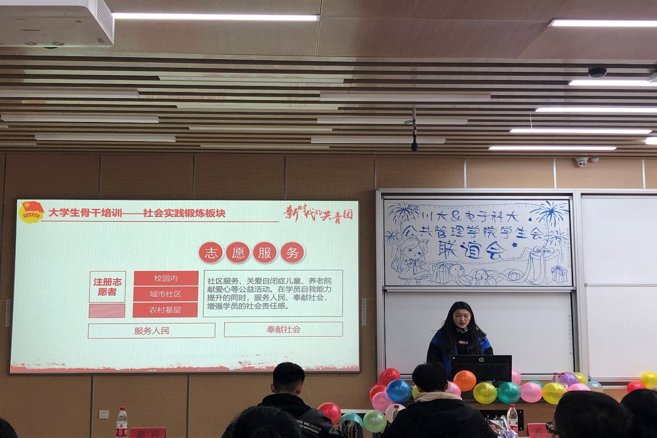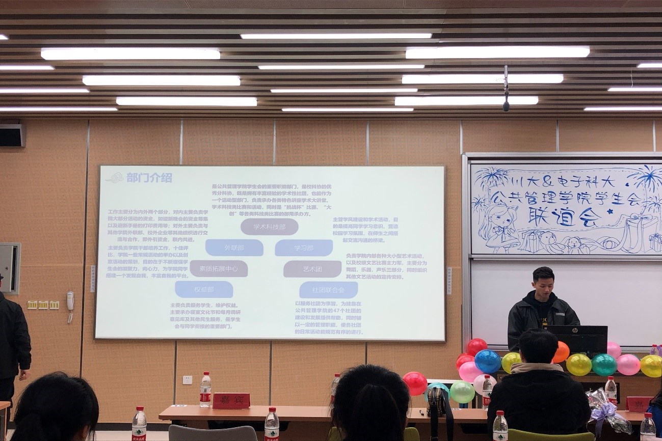 接着,电子科技大学太阳集团tyc9728团委副书记孙琳瑛元同学发言。孙同学以“新时代,新作为,新篇章”作为开篇立意,以“新形势下电子科技大学太阳集团tyc9728基层团组织工作探索与实践”为主题,系统性地介绍了电子科技大学太阳集团tyc9728学生组织架构、大学生骨干培育工程。接下来,由电子科技大学太阳集团tyc9728学生会主席崔振鑫及各部门的部长代表上台做发言和展示,分别介绍了各部门职能定位、活动风采、组织建设和创新实践等方面的内容。