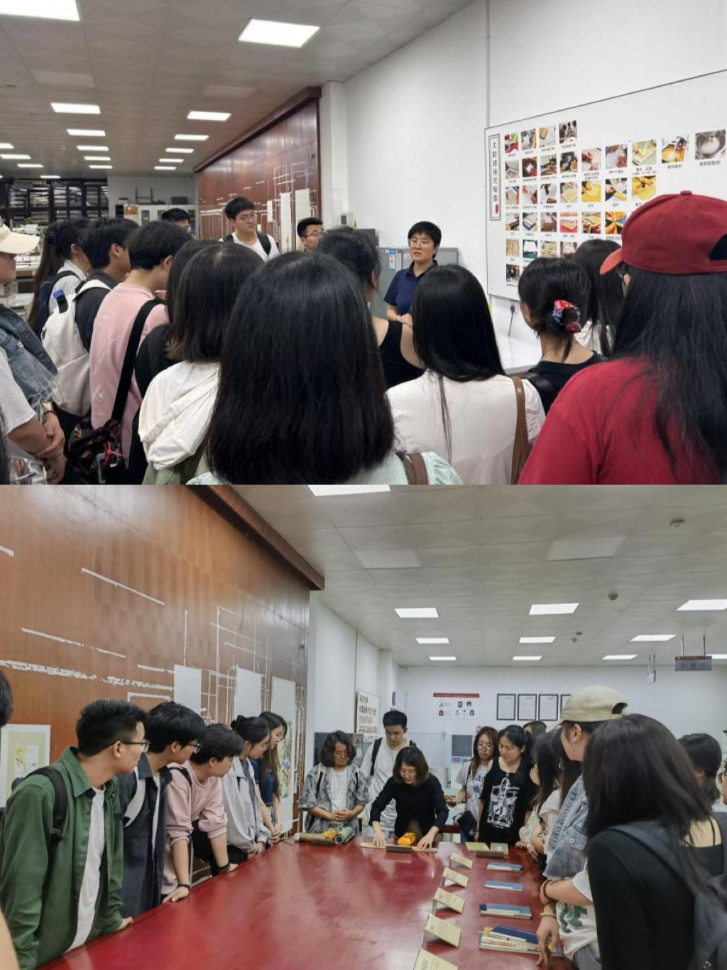 古籍修复室负责人许卫红老师向同学们介绍了古籍修复工作的流程、常用设备和工具,王丽老师依托修复室陈列的卷轴装、经折装、蝴蝶装等10余件样本,为同学们系统介绍了我国古籍装帧技艺的演变历程。