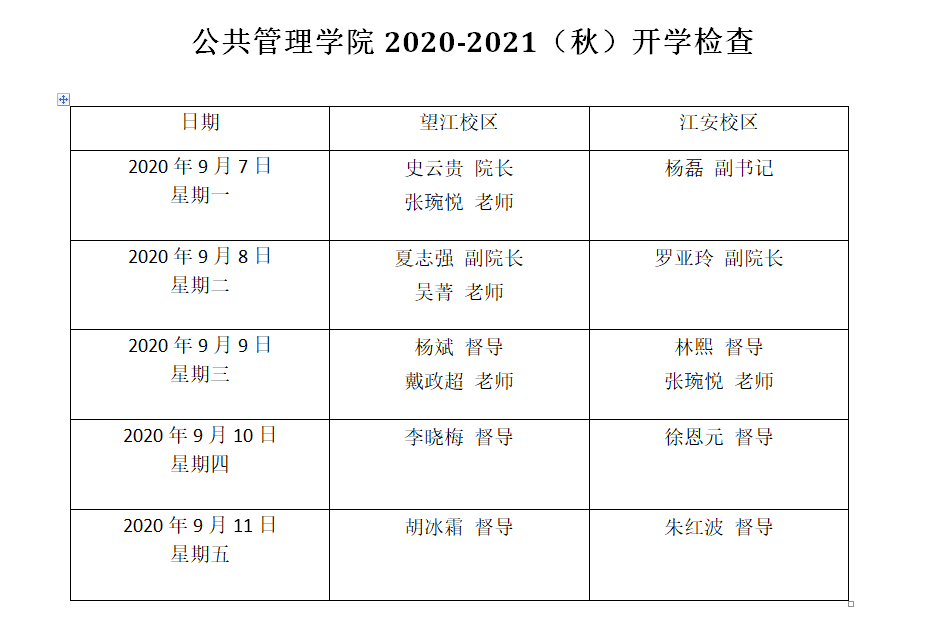 1、学院制定开学教学检查一周工作安排表,做到望江、江安两个校区全覆盖,并将开学教学检查责任落实到个人,全院正副职院领导、本科教学督导组成员、本科教务秘书、本科教学管理人员等参与检查。院长史云贵、副书记杨磊、副院长夏志强、副院长罗亚玲,本科教学督导组胡冰霜、徐恩元、杨斌、朱红波、李晓梅等老师、本科教务秘书林熙老师以及本科教学管理人员吴菁、戴政超、张琬悦等对新学期的课程安排与上课情况进行了检查。开学检查分设望江校区和江安校区两个部分,以下是我院制定并依之执行的开学教学检查安排表: