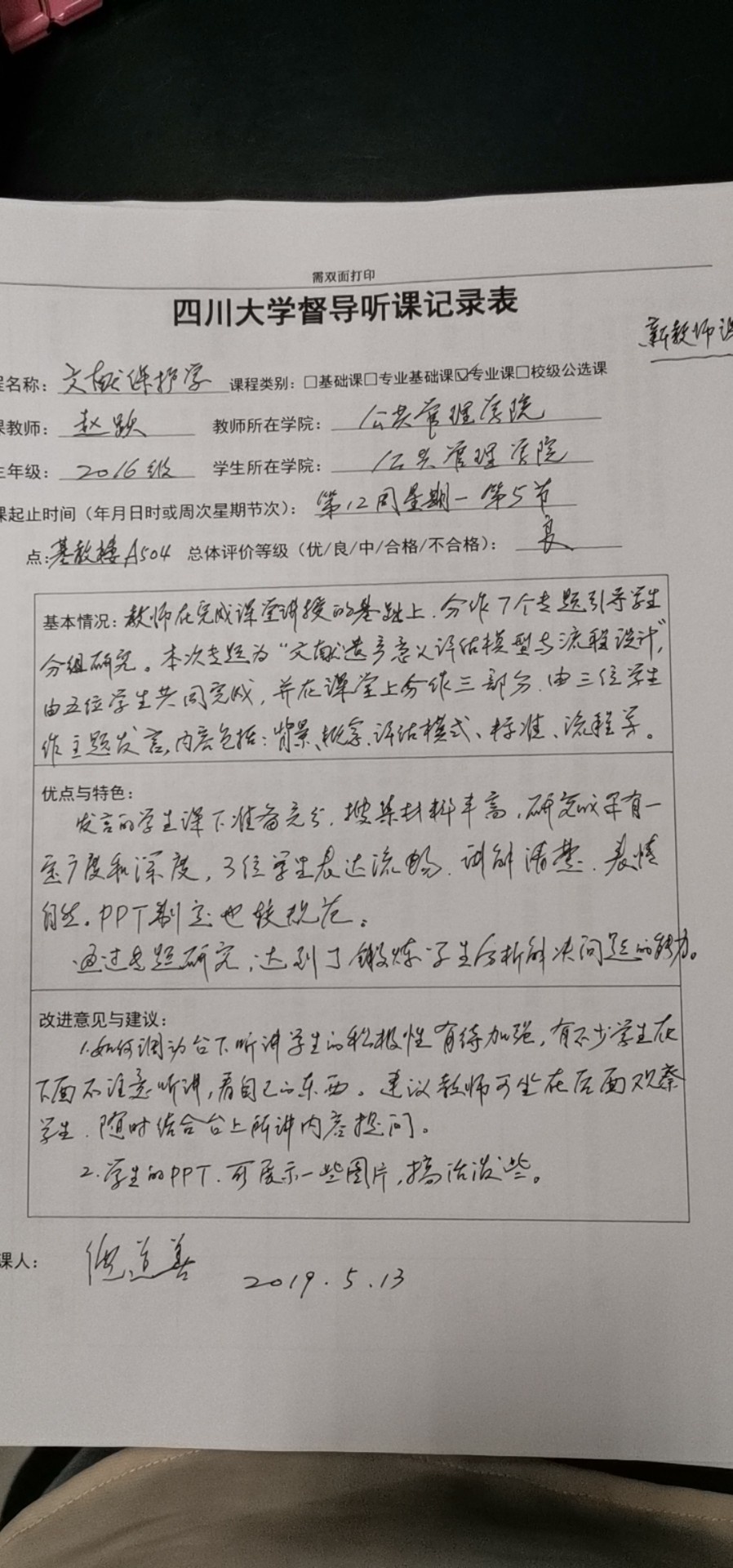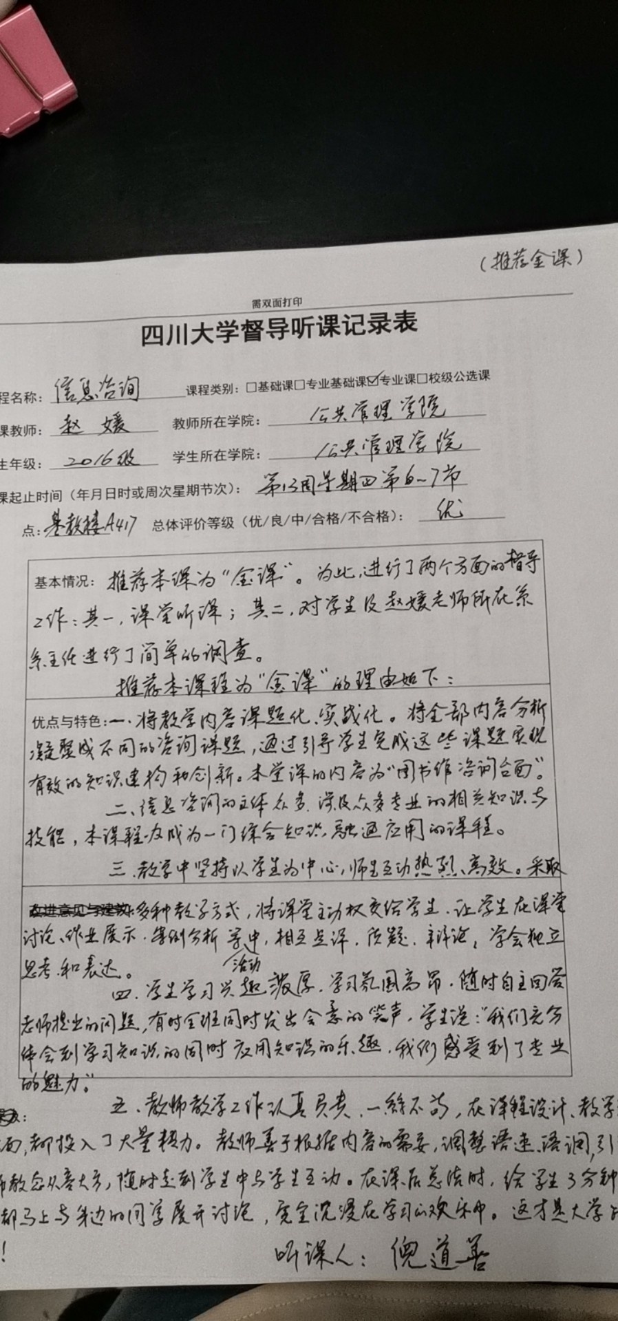 例如督导组副组长倪道善老师,听课前充分调查,重点听取新开课、新教师课、精品课、教改课,根据课堂教学内容、方式及师生互动课堂效果等,反馈改进意见或者推荐原因。
