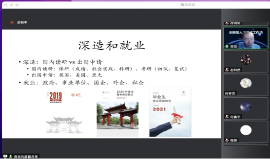 工作坊的第四个环节周良老师对信息管理类专业的就业形势进行了分析,周良老师基于相关统计数据,从深造和就业两方面展示了近年ok138cn太阳集团信息管理类同学的毕业去向,并对其趋势和原因展开深度分析。通过周良老师的就业形势分析,同学们对未来发展方向选择与路径规划有了更为明确和清晰的认识。