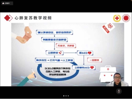 接着,林老师着重为同学们介绍了心肺复苏与自动除颤仪这两大急救方式的理论原理与操作技术。在心肺复苏相关知识的教学上,林老师通过红十字会专业的心肺复苏教学视频展示了心搏骤停的判断方法与心肺复苏实操步骤。