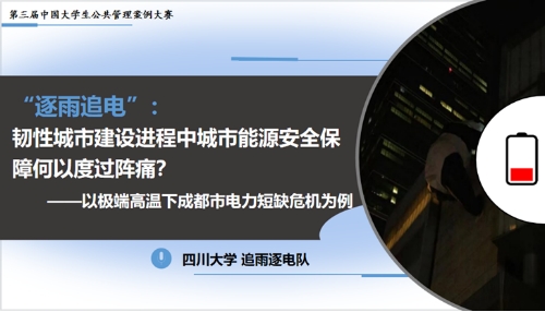 在行政管理系张伟研究员的悉心指导下,由我院行政管理专业2020级本科生王谌诗棋、劳动与社会保障专业2020级本科生金珂安、牟芳娇同学组成的追雨逐电队,凭借高质量的案例文本与决赛现场的精彩答辩赢得了评委专家的高度肯定,最终斩获全国“金奖”荣誉。参赛案例《“逐雨追电”:韧性城市建设进程中城市能源安全保障何以度过阵痛?——以极端高温下成都市电力短缺危机为例》聚焦于今夏成都市供电危机事件,运用韧性理论和4R危机管理理论分析了危机爆发的现实困境和延伸逻辑进而从城市能源安全供给的视角寻求成都市韧性城市建设的突破路径。