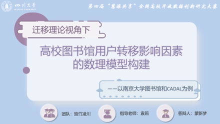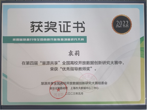 在袁莉老师的悉心指导下,我院信息资源管理专业2021级本科生蒙新梦同学的“独竹凌川”团队,以《迁移理论视角下高校图书馆用户转移影响因素的数理模型构建——以南京大学图书馆和CADAL为例》为题,探究高校图书馆用户由传统图书馆向数字图书馆转移的影响因素,为高校图书馆的发展探寻新方向,最后经过激烈答辩,荣获“三等奖”,袁莉老师获得“优秀指导教师奖”。