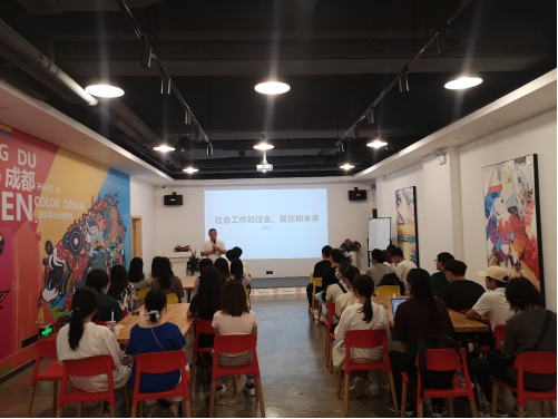 为了使同学们在课堂外进一步了解专业社区工作的产生和发展过程,深度剖析社会工作行业发展过程中形成的社会困境及其解决之道,增加《社会心理学》关于社会困境有关知识的感性体验,我院2022级社会工作本科生在刘传军老师的带领下,于6月8日下午来到成都市武侯区青年之家、武侯区聚落青年服务中心,进行《社会心理学》课程实践教学活动。武侯区聚落青年服务中心负责人、实务授课郭常波老师为本次实践交流做了精心准备,以“社会工作的过去、现在和未来”为题交流了他对整个行业发展的观察和体会,以“从我的历程回观社工机构的异化”为题交流了他关于行业和机构发展困境及其破解之道的见解。