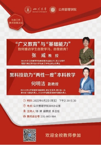 1.胡荣教授应邀为我院学子做“我的社会单位理论” 学术报告 2.我院2022级社会工作专业《社会心理学》课程实践教学在武侯青年之家顺利开展 3.社会学与心理学系“教师发展与本科教学”交流会顺利举行 4.2022级本科社会工作专业开展“黑暗中对话”课程实践 |
