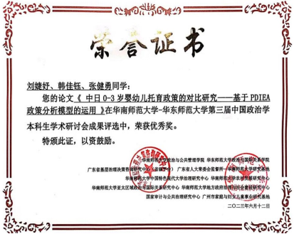 6月9日—6月11日,“第三届中国政治学本科生学术研讨会”在华南师范大学召开。我院2020级土地资源管理本科生张健勇同学撰写的论文《可持续生计视角下宅基地退出的农户意愿及现实困境研究——基于四川省3县30个村社的调查》获得二等奖,2020级土地资源管理本科生刘婕妤同学撰写的论文《中日0-3岁婴幼儿托育政策的对比研究——基于PDIEA政策分析模型的运用》获得优秀奖。