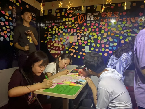 在导赏员和同行伙伴的陪伴下,75分钟的黑暗时光很快过去,同学们和导赏员一起交流了对建设无障碍社会的构想。大家被导赏员积极阳光的心态打动,提升了对视障群体的同理心,纷纷在留言墙上留下感言。