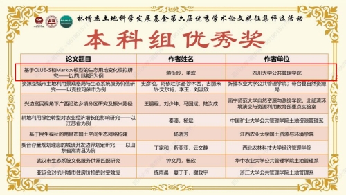 通过参加此次“林增杰土地科学发展基金优秀学术论文征集评奖”活动,我院学生与同领域的各类高校学生进行了充分的学术交流,获得了领域内权威专家的宝贵建议和点评,更深层次地接触了学术前沿、锻炼了科研能力、拓宽了学术视野。同时此次活动的评选结果为川大太阳集团tyc9728赢得了声誉,同时也体现了土地资源管理系国家级一流本科专业建设成效。