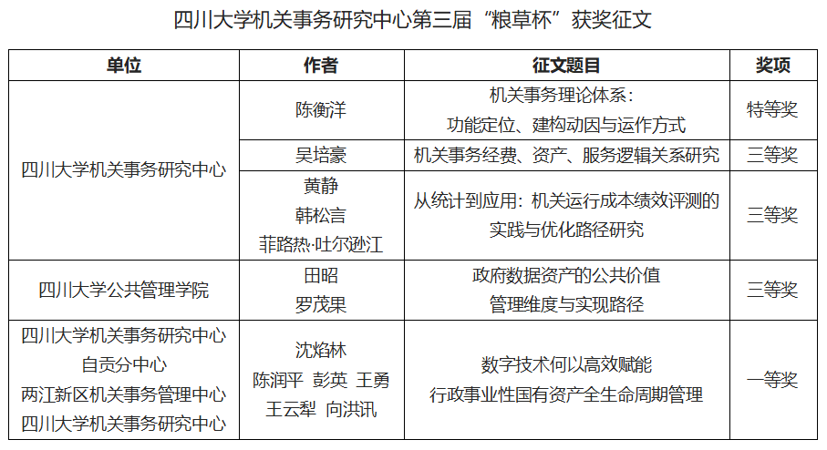 近日,由四川省机关事务管理研究会举办的第三届“粮草杯”征文比赛结果公布,我中心在机关事务理论研究领域再创佳绩!此次征文比赛,我中心推荐报送的理论研究文章荣获特等奖1项,一等奖1项,三等奖3项!相关荣誉不仅印证了我中心在理论研究领域的深厚积淀与创新活力,更激励我们向更高的目标迈进。