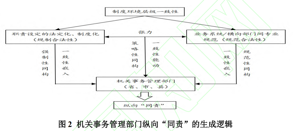 将办公用房管理和公务用车管理的职责配置给机关事务管理部门,原因在于这些职责并不关涉其他部门的核心专业领域,并且按照历史惯例和分工,这些职责原本就由机关事务管理部门履行。总之,机关事务管理业务系统内的专业规范以及不同部门间职责归属的专业规范具有兼容性,共同驱动规范性同构,推动机关事务管理部门纵向“同责”。